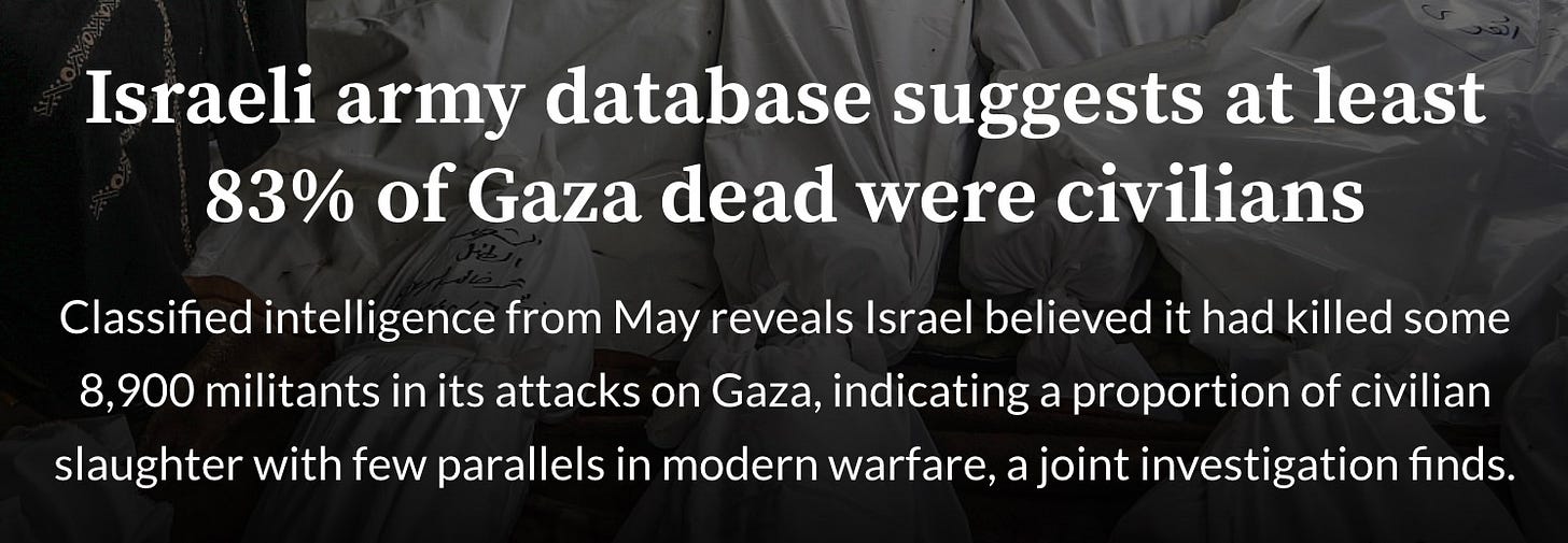 Israeli intelligence knows and has known (for months? since October 2023?) that the vast majority of the Palestinians killed by Israeli soldiers were civilians. 83%.